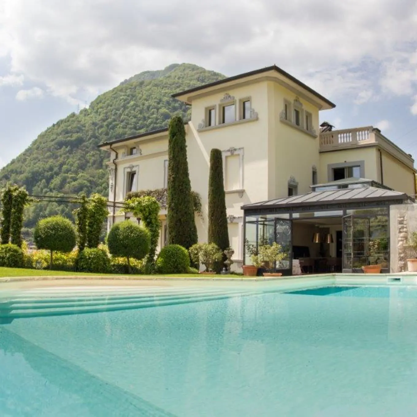 Our five-bedroom villa is blessed with breathtaking lake views. The sunroom is the perfect spot for an aperitif—or sip Italian wines from your cellar in the garden, on the lake view terrace, or by the private pool.